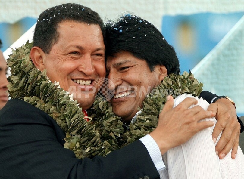写真は、第2回「南米共同体首脳会議(Community of South American Nations Summit)」で、ボリビアのエボ・モラレス(Evo Morales)大統領(右)と抱き合うチャベス大統領(左、2006年12月9日撮影)。(c)AFP/Aizar RALDES