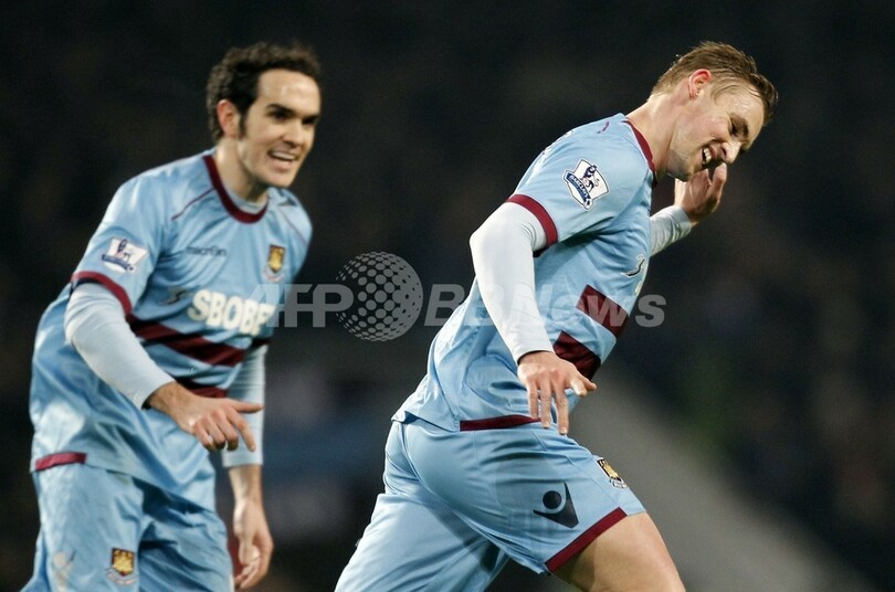 前半18分に先制点を決め喜ぶウェストハムのジャック・コリゾン(Jack Collison、右、2013年1月23日撮影)。(c)AFP/IAN KINGTON