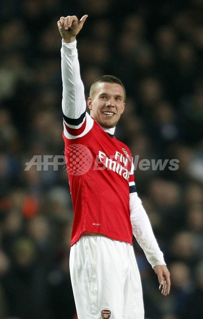 前半22分に同点ゴールを決め喜ぶアーセナルのルーカス・ポドルスキー(Lukas Podolski、2013年1月23日撮影)。(c)AFP/IAN KINGTON