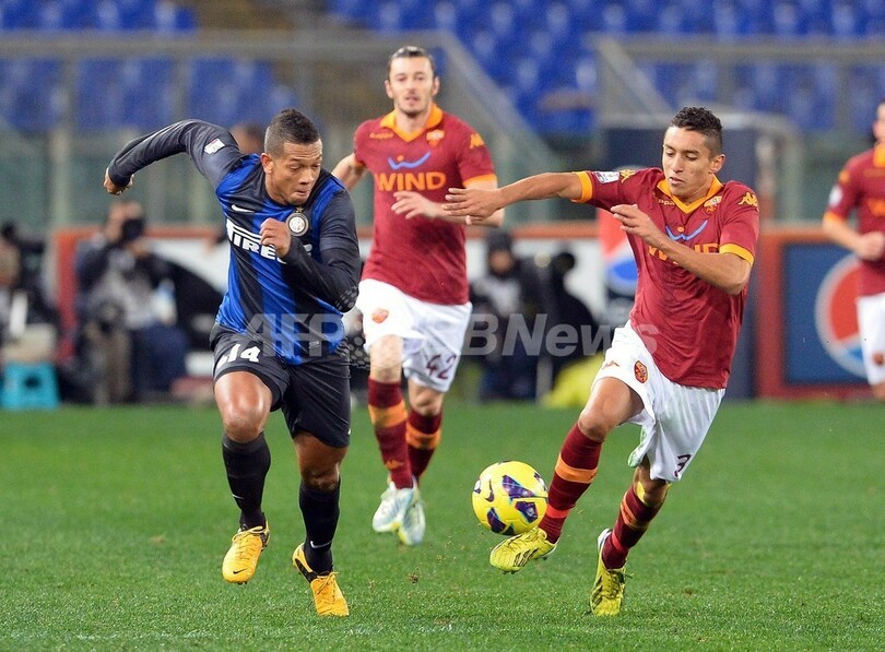 インテルのフレディ・グアリン(Freddy Guarin、左)とボールを競るASローマのマルキーニョ (Marco Antonio de Mattos Filho 'Marquinho'、2013年1月23日撮影)。(c)AFP/VINCENZO PINTO