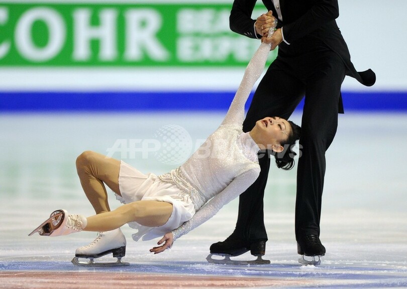 演技に臨むロシアの川口悠子(Yuko Kawaguchi)/アレクサンドル・スミルノフ(Alexander Smirnov)組(2013年1月23日撮影)。(c)AFP/HRVOJE POLAN