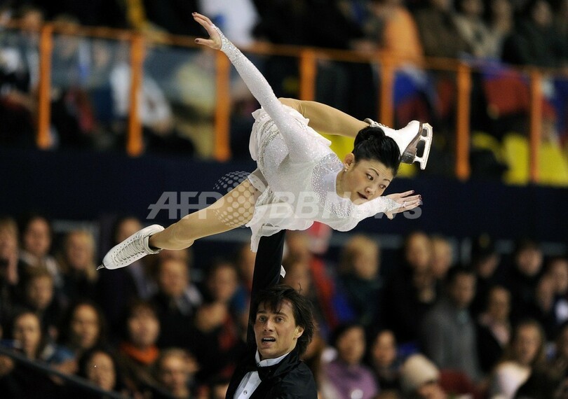 演技に臨むロシアの川口悠子(Yuko Kawaguchi)/アレクサンドル・スミルノフ(Alexander Smirnov)組(2013年1月23日撮影)。(c)AFP/HRVOJE POLAN