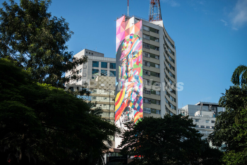 【1月24日 AFP】ブラジル・サンパウロ(Sao Paulo)の中心部で、高さ56メートルのビルの壁に、昨年12月に亡くなった同国を代表する建築家オスカー・ニーマイヤー(Oscar Niemeyer)氏の肖像を描く、同国の壁画アーティスト、エドゥアルド・コブラ(Eduardo Kobra)さん。世界的に有名なコブラさんは5年前にビルの管理者と交渉を始め、ようやくいま、夢が実現した。25日にサンパウロ市が誕生459年を迎えるのを前に、コブラさんは自主的に制作を進めている。(c)AFP