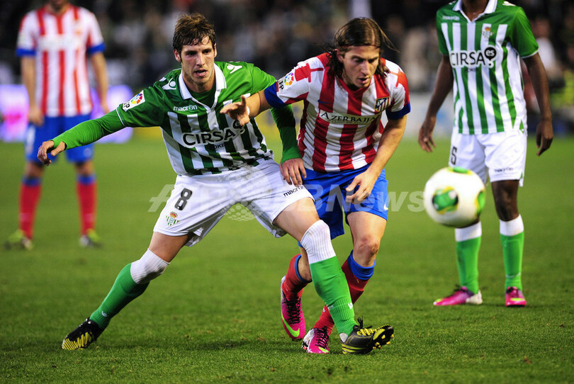 レアル・ベティスのルベン・ペレス (Ruben Perez、左)とボールを競るアトレティコ・マドリードのフィリペ・ルイス・カスミルスキ(Filipe Luis Kasmirski、2013年1月24日撮影)。(c)AFP/CRISTINA QUICLER