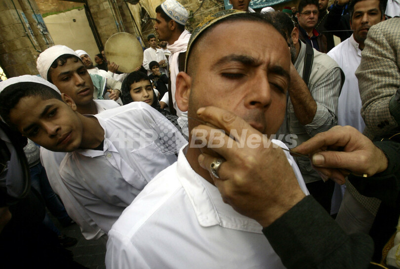 【1月25日 AFP】イスラム教の預言者ムハンマド(Mohammed)の生誕祭「Mawlid al-Nabawi」の24日、レバノン南部の港町サイダ(シドン、Sidon)ではスーフィー(Sufi、イスラム神秘主義者)たちが頬に金属の串を刺すなどして儀式に参加した。(c)AFP