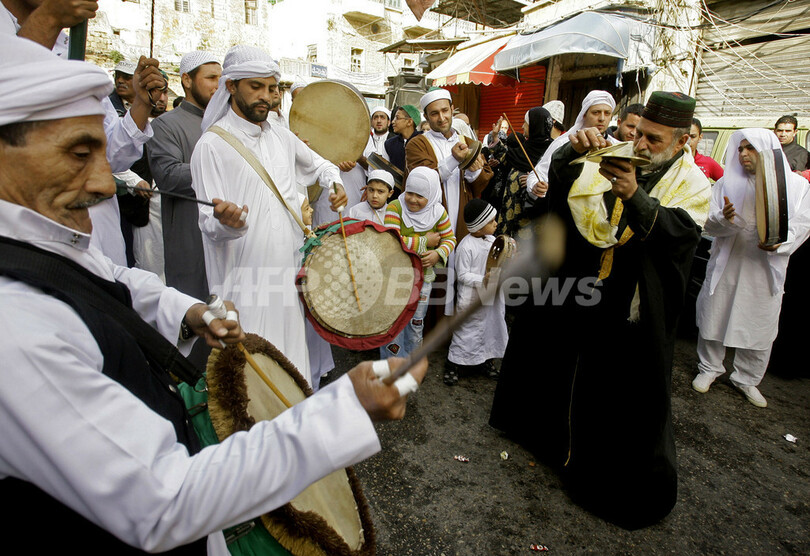 写真は、預言者生誕祭の儀式で楽器を鳴らして行進するスーフィー(イスラム教神秘主義者)ら(2013年1月24日撮影)。(c)AFP/MAHMOUD ZAYYAT