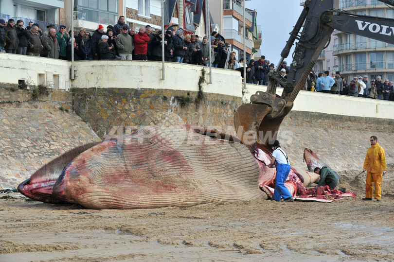 ニュース 環境・科学 全長18メートルのクジラ、仏西部の海岸に漂着 2013年1月26日 16:51 発信地:レ・サーブル・ドロンヌ/フランス [ ヨーロッパ フランス ] このニュースをシェア ‹ › ❮ 4/22 ❯ フランス西部レ・サーブル・ドロンヌ(Les Sables d'Olonne)の海岸で25日早朝、全長18メートルのクジラが打ち上げられているのがみつかった。写真は、浜辺で解体されるクジラと集まった人たち(2013年1月25日撮影)。(c)AFP/FRANK PERRY 画像作成中 ! 【1月26日 AFP】フランス西部レ・サーブル・ドロンヌ(Les Sables d'Olonne)の海岸で25日早朝、全長18メートルのクジラが打ち上げられているのがみつかった。(c)AFP 環境・科学 一覧へ> メディア・報道関係・法人の方向け 写真・動画 購入のお問合せ>