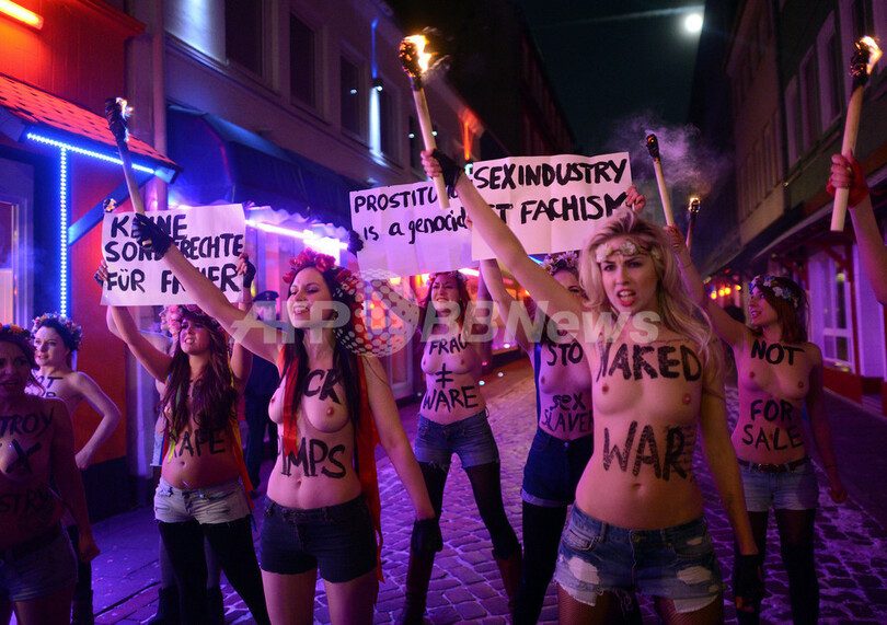 ウクライナの女性権利団体「FEMEN」のメンバーらが25日、ドイツ北部ハンブルク(Hamburg)の赤線地区に集結。「女性は売り物ではない」と書かれた横断幕を掲げ、デモ行進を行った。