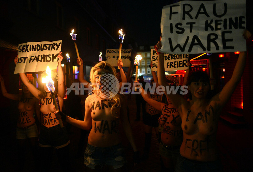 ウクライナの女性権利団体「FEMEN」のメンバーらが25日、ドイツ北部ハンブルク(Hamburg)の赤線地区に集結。「女性は売り物ではない」と書かれた横断幕を掲げ、デモ行進を行った。