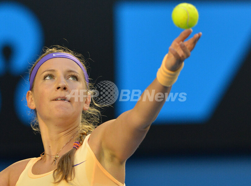 サーブトスを上げるビクトリア・アザレンカ(2013年1月26日撮影)。(c)AFP/PAUL CROCK