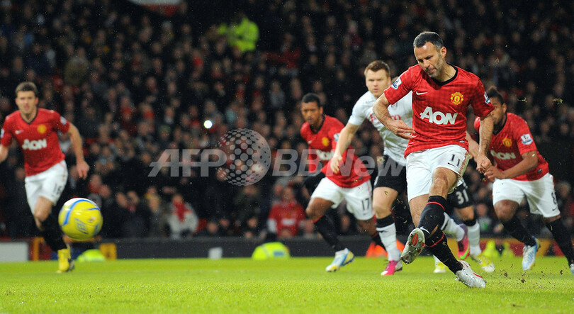 前半3分に先制点となるPKを決めるマンチェスター・ユナイテッドのライアン・ギグス(Ryan Giggs、右手前、2013年1月26日撮影)。(c)AFP/ANDREW YATES