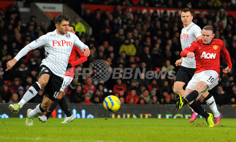 後半5分にチームの2点目となるシュートを放つマンチェスター・ユナイテッドのウェイン・ルーニー(Wayne Rooney、右、2013年1月26日撮影)。(c)AFP/ANDREW YATES