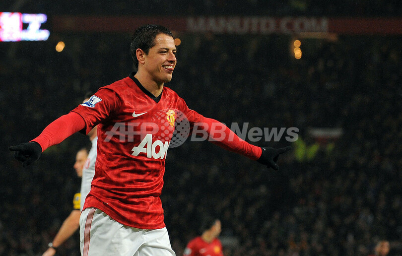 得点を挙げ喜ぶマンチェスター・ユナイテッドのハビエル・エルナンデス(Javier Hernandez、2013年1月26日撮影)。(c)AFP/ANDREW YATES