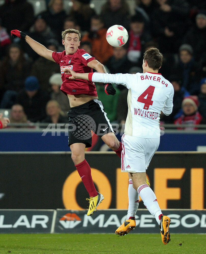 ボールを 競るバイヤー・レバークーゼンのフィリップ・ヴォルスハイト(Philipp Wollscheid、右)とSCフライブルクのマックス・クルーゼ(Max Kruse、2013年1月26日撮影)。(c)AFP/FREDERICK FLORIN