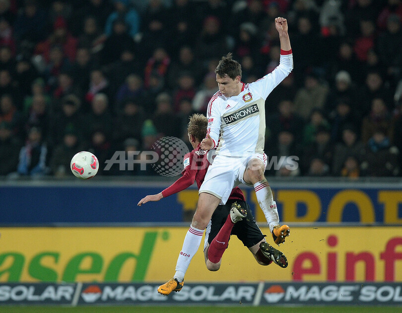 SCフライブルクのヤン・ローゼンタル(Jan Rosenthal、奥)とボールを 競るバイヤー・レバークーゼンのフィリップ・ヴォルスハイト(Philipp Wollscheid、2013年1月26日撮影)。(c)AFP/FREDERICK FLORIN