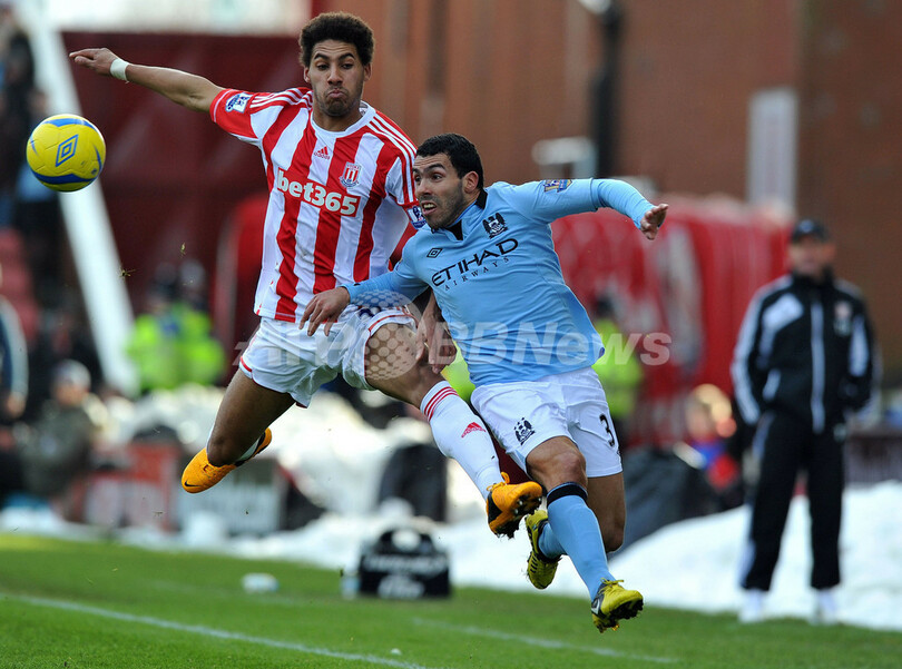 ストーク・シティのライアン・ショットン(Ryan Shotton、左)とボールを競るマンチェスター・シティのカルロス・テベス(Carlos Tevez、2013年1月26日撮影)。(c)AFP/Paul Ellis