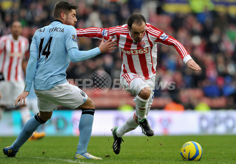 マンチェスター・シティのハビ・ガルシア(Javi Garcia、左)とボールを競るストーク・シティのマシュー・エセリングトン(Matthew Etherington、2013年1月26日撮影)。(c)AFP/Paul Ellis