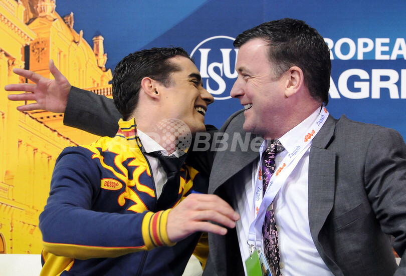 キスアンドクライでブライアン・オーサー(Brian Orser)コーチ(右)と喜ぶスペインのハビエル・フェルナンデス(Javier Fernandez、2013年1月26日撮影)。(c)AFP/ATTILA KISBENEDEK
