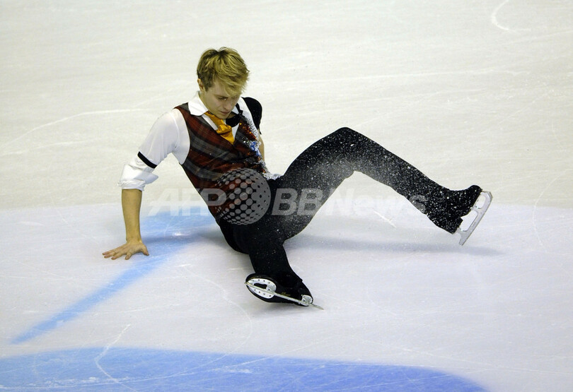 演技の途中で転倒するミハル・ブレジナ(Michal Brezina、2013年1月26日撮影)。(c)AFP/HRVOJE POLAN