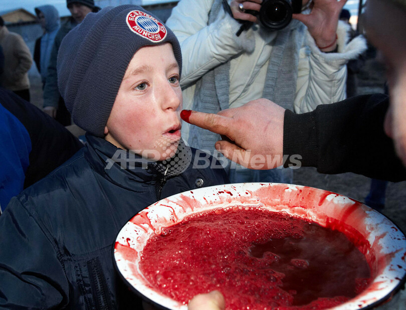 写真は参加者からブタの血を鼻につけられる少年(2013年1月26日撮影)。(c)AFP/OLEXANDER ZOBIN