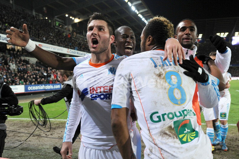 後半38分にジョルダン・アイェウ(Jordan Ayew、右)が決めたチームの2得点目を喜ぶロド・ファニ(Rod Fanni、中央奥)、モルガン・アマルフィタノ(Morgan Amalfitano、左)らオリンピック・マルセイユの選手(2013年1月26日撮影)。(c)AFP/JEAN FRANCOIS MONIER
