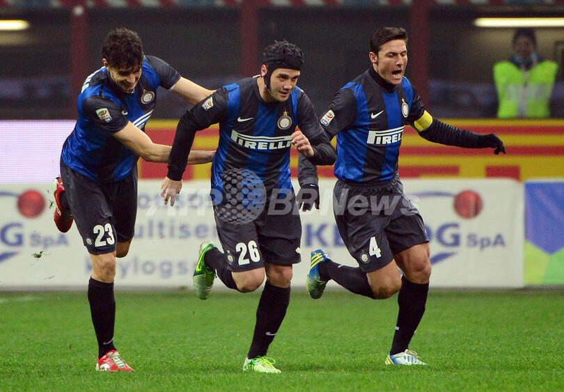 前半5分に先制点を挙げチームメイトと喜ぶインテルのクリスティアン・キヴ(Cristian Chivu、中央、2013年1月27日撮影)。(c)AFP/OLIVIER MORIN