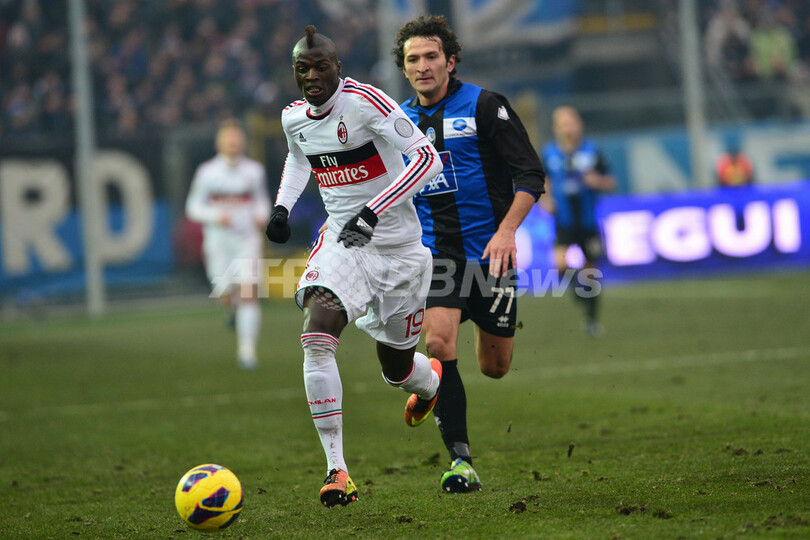 アタランタのクリスティアン・ライモンディ(Cristian Raimondi、奥)の前でボールを運ぶACミランのムバイエ・ニアン(Mbaye Niang、2013年1月27日撮影)。(c)AFP/GIUSEPPE CACACE