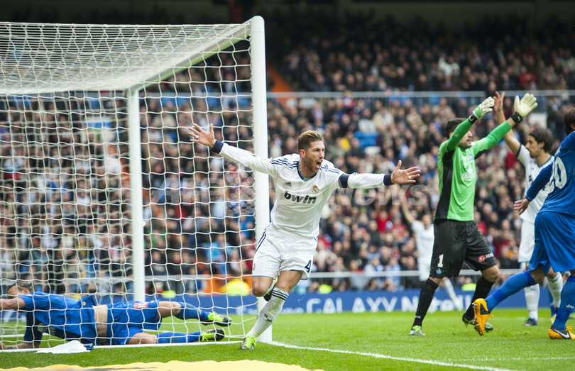 後半10分に先制ゴールを決めて歓喜するレアル・マドリードのセルヒオ・ラモス(Sergio Ramos、2013年1月27日撮影)。(c)AFP/DANI POZO