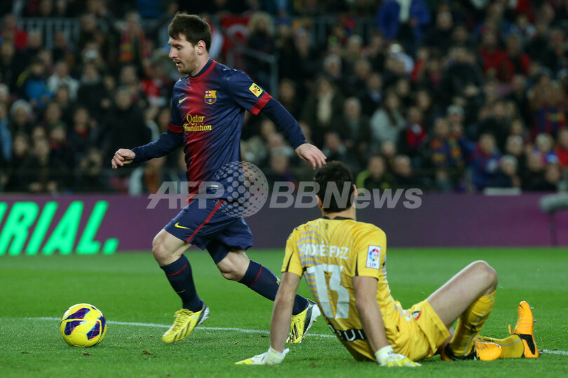 オサスナのGKアンドレス(Andres Eduardo Fernandez Moreno、右)をかわすFCバルセロナのリオネル・メッシ(Lionel Messi、2013年1月27日撮影)。(c)AFP/QUIQUE GARCIA
