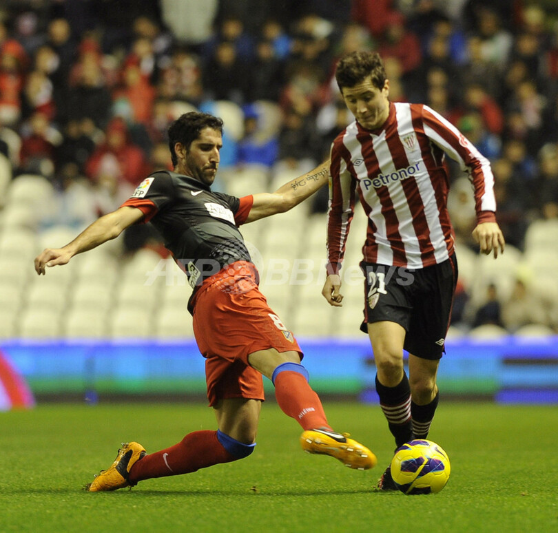 ボールを競るアスレティック・ビルバオのアンドレ・エレーラ(Ander Herrera、右)とアトレティコ・マドリードのラウル・ガルシア(Raul Garcia、2013年1月27日撮影)。(c)AFP/RAFA RIVAS