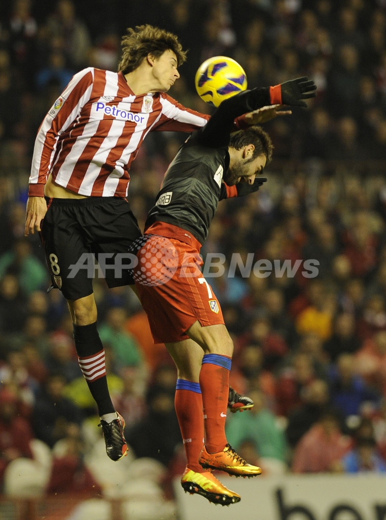 空中でボールを競るアトレティコ・マドリードのアドリアン・ロペス(Adrian Lopez、右)とアスレティック・ビルバオのアンデル・イトゥラスペ(Ander Iturraspe、2013年1月27日撮影)。(c)AFP/RAFA RIVAS