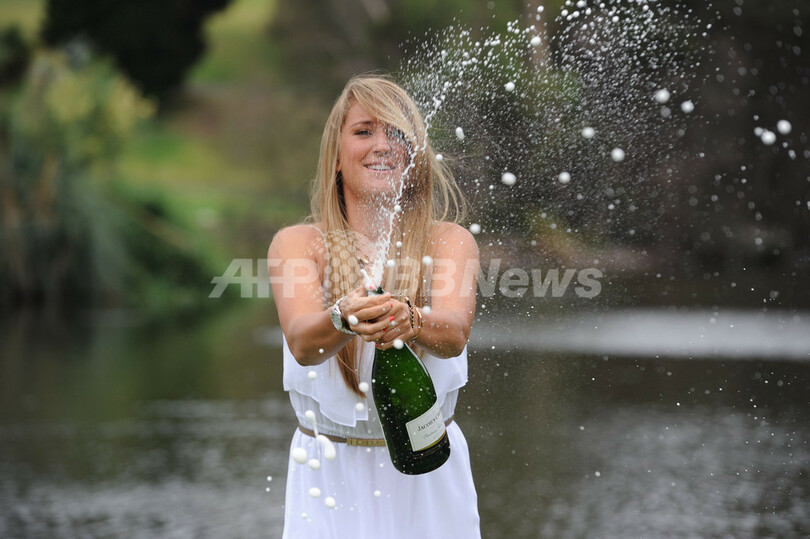 シャンパンを振るビクトリア・アザレンカ(2013年1月27日撮影)。(c)AFP/GREG WOOD