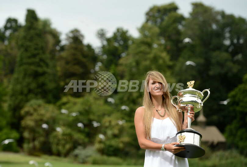 【1月27日 AFP】全豪オープンテニス(Australian Open Tennis Tournament 2013)女子シングルスで大会2連覇を飾ったビクトリア・アザレンカ(Victoria Azarenka、ベラルーシ)が27日、メルボルン(Melbourne)市内で優勝トロフィーを手に写真撮影に臨んだ。(c)AFP