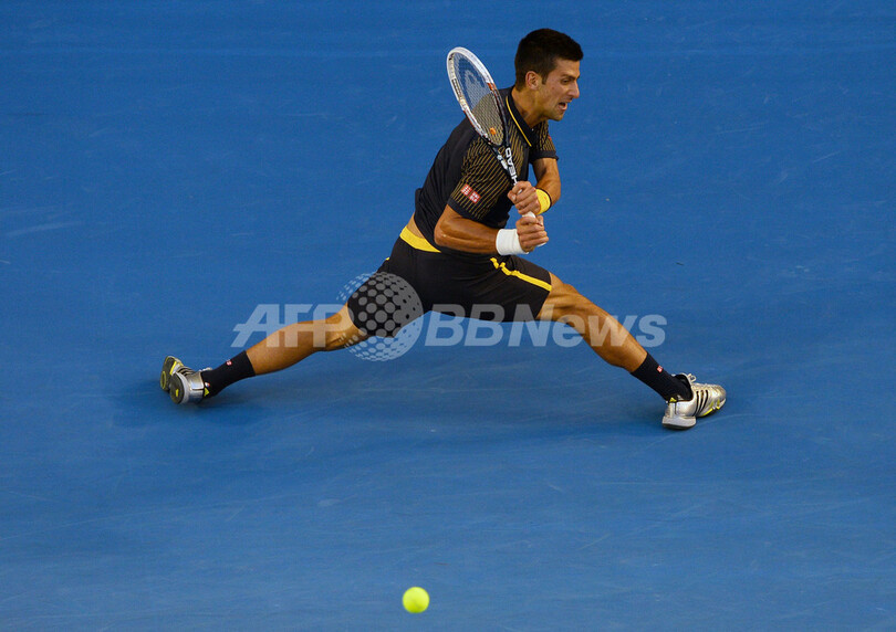 リターンを打つノバク・ジョコビッチ(2013年1月27日撮影)。(c)AFP/WILLIAM WEST