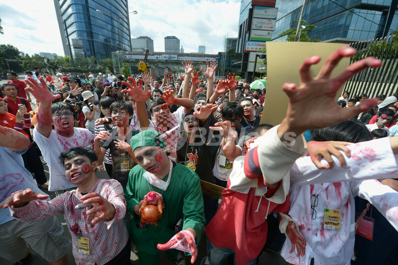 ニュース ライフ インドネシアでゾンビが行進、洪水被害の募金呼び掛け 2013年1月31日 16:45 発信地:ジャカルタ/インドネシア [ アジア・オセアニア インドネシア ] このニュースをシェア ‹ › ❮ 6/16 ❯ インドネシアの首都ジャカルタ(Jakarta)で27日、インドネシア・ゾンビ・クラブ(Indonesian Zombie Club、IZOC)のメンバー数百人がゾンビ姿で市内を行進した。ジャカルタは今月中旬に洪水に見舞われたことから、ゾンビ行進は洪水後の市内清掃の呼び掛けと被災者への募金を目的に企画された(2013年1月27日撮影)。(c)AFP/ADEK BERRY 画像作成中 ! 【1月31日 AFP】インドネシアの首都ジャカルタ(Jakarta)で27日、インドネシア・ゾンビ・クラブ(Indonesian Zombie Club、IZOC)のメンバー数百人がゾンビ姿で市内を行進した。ジャカルタは今月中旬に洪水に見舞われたことから、ゾンビ行進は洪水後の市内清掃の呼び掛けと被災者への募金を目的に企画された。(c)AFP ライフ 一覧へ> メディア・報道関係・法人の方向け 写真・動画 購入のお問合せ>