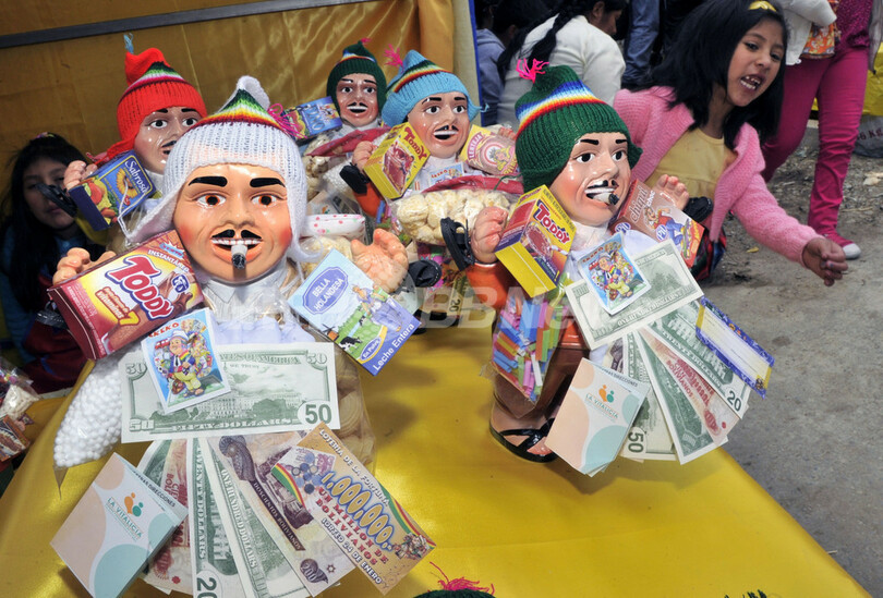 24日に開幕した祭典「アラシタ(Alasita)」の名前は、先住民族アイマラ(Aymara)人の言葉で「買って」を意味する。豊作と多産の神「エケコ(Ekeko)」をたたえる祭りだ。
