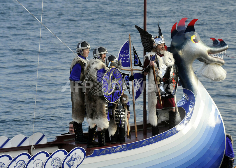 ニュース ライフ バイキングの火祭り、英シェトランド諸島 2013年1月30日 10:50 発信地:ラーウィック/英国 [ ヨーロッパ 英国 ] このニュースをシェア ‹ › ❮ 32/32 ❯ 英シェトランド諸島(Shetland Islands)のラーウィック(Lerwick)で29日、毎年恒例のスカンディナビア系バイキングの威光を祝う祭典「ウップヘリーアー(Up Helly Aa)」が開催された。バイキングの衣装を身にまとった約1000人の参加者が町中を行進し、夕暮れ時には「ロングボート(バイキングが使った帆船)」に燃え立つたいまつを投げ込み、火の祭典を楽しんだ。写真は、バイキングの衣装を着用し、ロングボートに乗船する人々(2013年1月29日撮影)。(c)AFP/ANDY BUCHANAN 画像作成中 ! 【1月30日 AFP】英シェトランド諸島(Shetland Islands)のラーウィック(Lerwick)で29日、毎年恒例のスカンディナビア系バイキングの威光を祝う祭典「ウップヘリーアー(Up Helly Aa)」が開催された。バイキングの衣装を身にまとった約1000人の参加者が町中を行進し、夕暮れ時には「ロングボート(バイキングが使った帆船)」に燃え立つたいまつを投げ込み、火の祭典を楽しんだ。(c)AFP ライフ 一覧へ> メディア・報道関係・法人の方向け 写真・動画 購入のお問合せ>