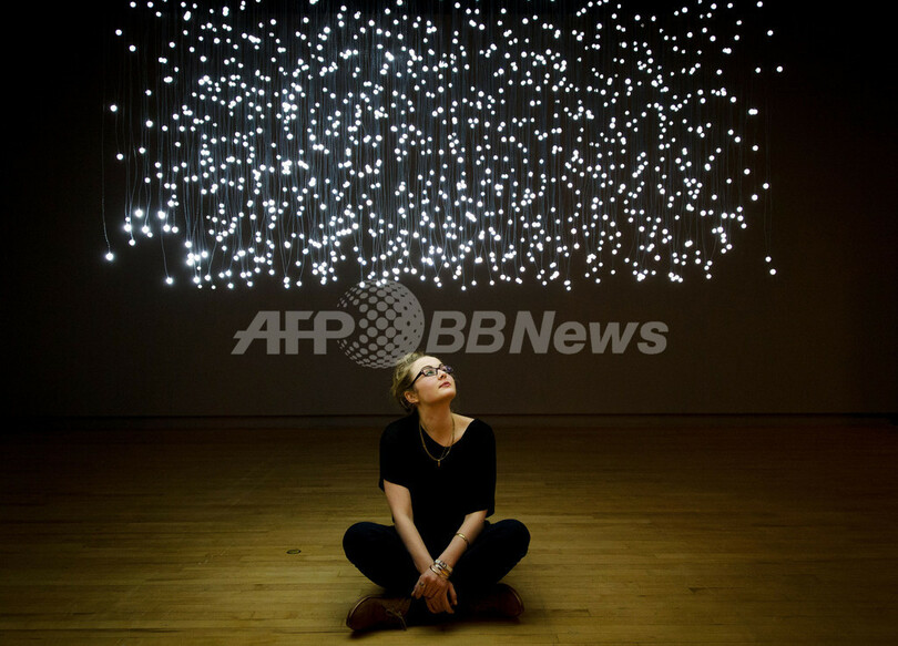 写真は、「Light Show」に出展されたジム・キャンベル(Jim Campbell)の作品「Exploded View(Commuters)」の下に座るジャーナリスト(2013年1月29日撮影)。(c)AFP/Leon Neal