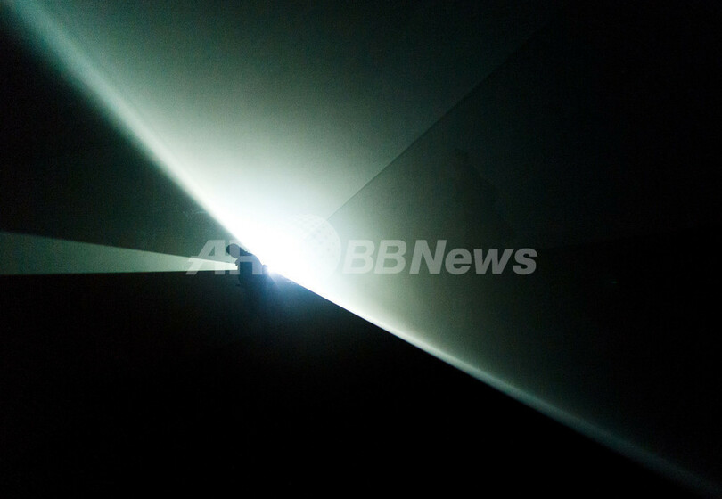 写真は、「Light Show」に出展された米国のアンソニー・マッコール(Anthony McCall)の作品「You and I, Horizontal」を通り抜ける人(2013年1月29日撮影)。(c)AFP/Leon Neal