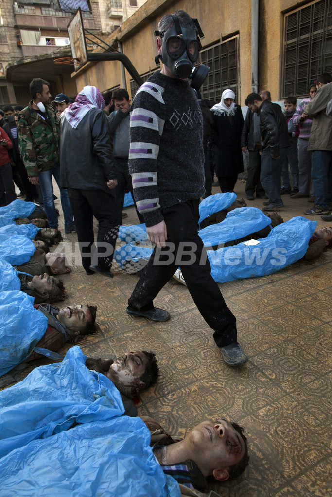 シリア・アレッポ(Aleppo)の市内を流れるクワイク川(Quweiq River)から収容された遺体が並ぶ同市ブスタン・アルカスル(Bustan al-Qasr)地区にある学校の校庭で、ガスマスクをかぶって親族を探す男性(2013年1月29日撮影)。(c)AFP/JM LOPEZ