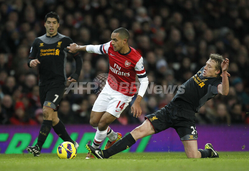 リバプールのルーカス・ペッツィーニ・レイヴァ (Lucas Pezzini Leiva、右)のタックルを受けるアーセナルのセオ・ウォルコット(Theo Walcott、中央、2013年1月30日撮影)。(c)AFP/IAN KINGTON