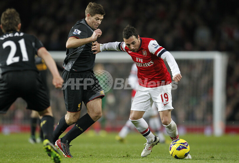 リバプールのスティーブン・ジェラード(Steven Gerrard)とボールを競るアーセナルのサンティ・カソルラ(Santi Cazorla、2013年1月30日撮影)。(c)AFP/IAN KINGTON