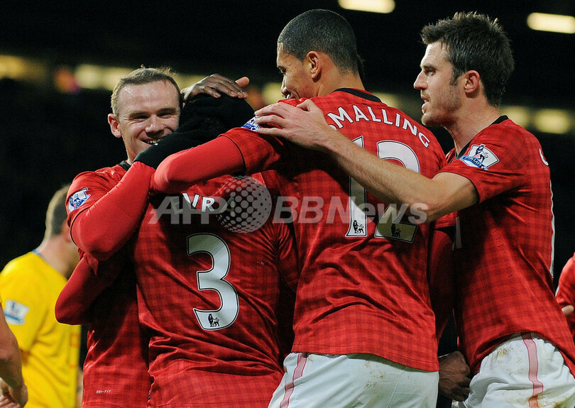 前半27分にウェイン・ルーニー(Wayne Rooney、左)が挙げたチーム2得点目に歓喜するマンチェスター・ユナイテッドの選手(2013年1月30日撮影)。(c)AFP/Andrew YATES
