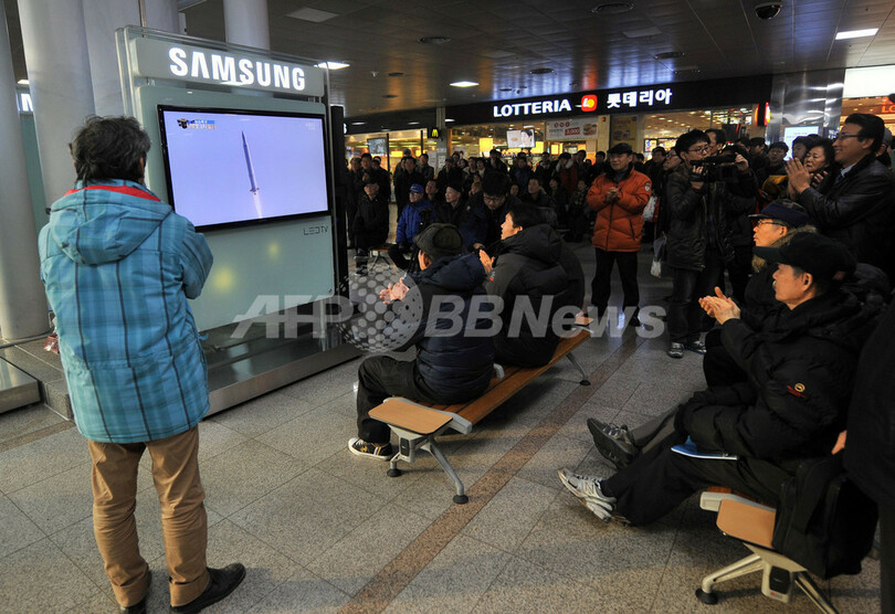 国の威信をかけた3度目のロケット打ち上げで、打ち上げは初めて成功した。ソウル(Seoul)の鉄道駅に設置された大型テレビの前には打ち上げの様子を見ようと、多くの人たちが集まった。(c)AFP