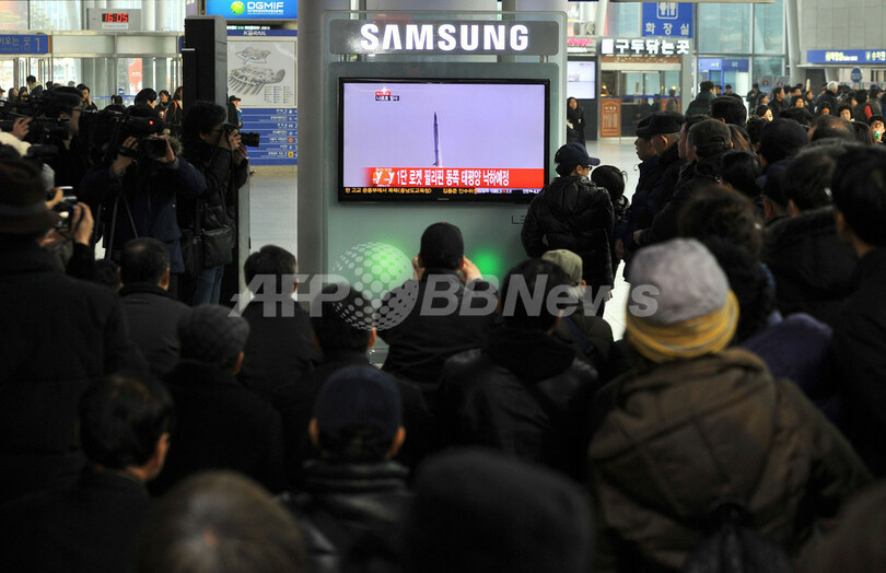 国の威信をかけた3度目のロケット打ち上げで、打ち上げは初めて成功した。ソウル(Seoul)の鉄道駅に設置された大型テレビの前には打ち上げの様子を見ようと、多くの人たちが集まった。(c)AFP