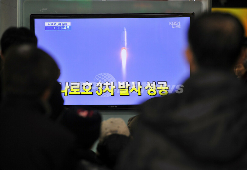 国の威信をかけた3度目のロケット打ち上げで、打ち上げは初めて成功した。ソウル(Seoul)の鉄道駅に設置された大型テレビの前には打ち上げの様子を見ようと、多くの人たちが集まった。(c)AFP