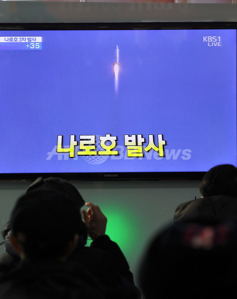 国の威信をかけた3度目のロケット打ち上げで、打ち上げは初めて成功した。ソウル(Seoul)の鉄道駅に設置された大型テレビの前には打ち上げの様子を見ようと、多くの人たちが集まった。(c)AFP