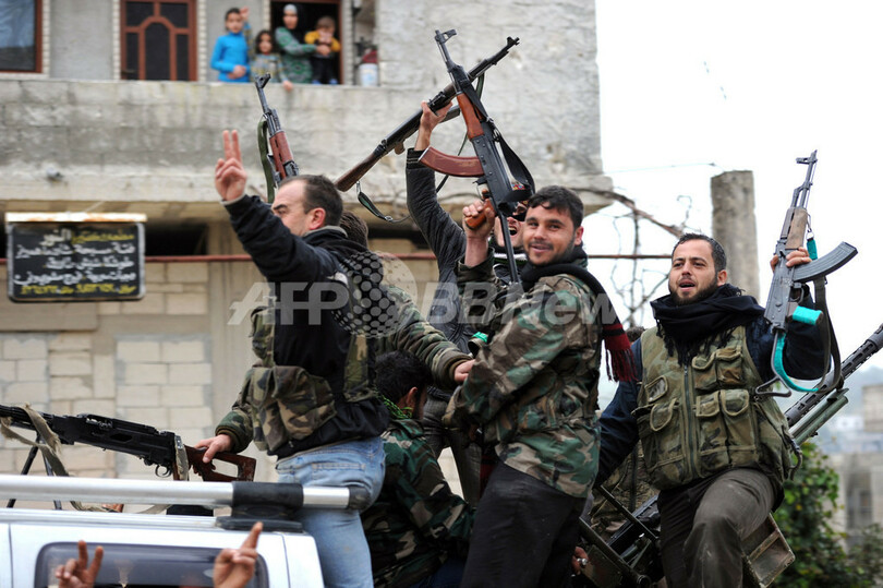 写真は、政府寄りの武装勢力との戦いで反政府派が勝利したイドリブ(Idlib)州の村で、勝利を喜ぶ反政府派の兵士たち(2013年1月30日撮影)。(c)AFP/AAMIR QURESHI