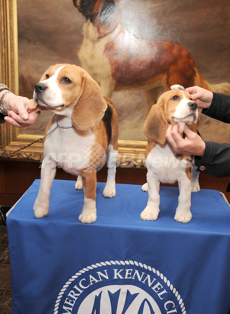 写真は、アメリカンケンネルクラブがニューヨーク(New York)で開いた人気犬種発表の記者会見に出席したビーグルの子犬たち(2013年1月30日撮影)。(c)AFP/Getty Images for the American Kennel Club/Gary Gershoff