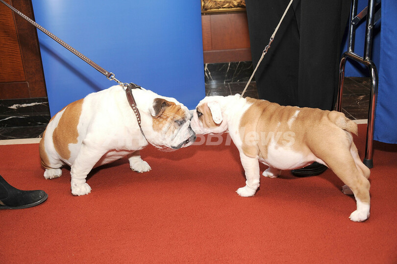 写真は、アメリカンケンネルクラブがニューヨーク(New York)で開いた人気犬種発表の記者会見に出席したブルドッグ(2013年1月30日撮影)。(c)AFP/Getty Images for the American Kennel Club/Gary Gershoff